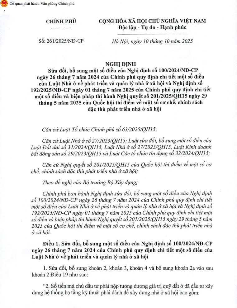 Ngày 10/10/2025, Chính phủ chính thức ban hành Nghị định 261/2025/NĐ-CP quy định chi tiết và hướng dẫn thi hành một số điều của Luật Nhà ở (sửa đổi) liên quan đến chính sách phát triển và quản lý Nhà ở xã hội (NOXH).